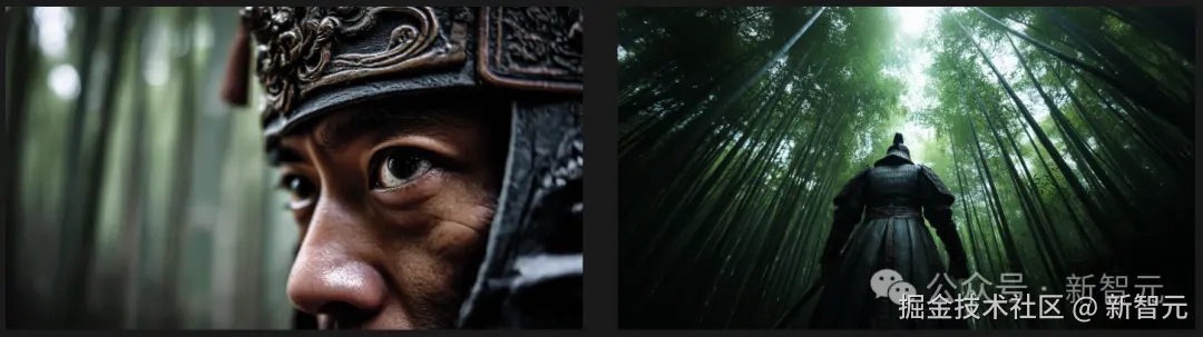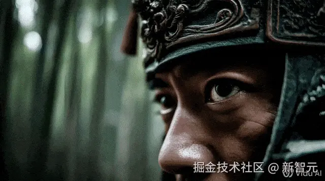 比如首帧是一个戴着头盔的男人坚毅的眼神,尾帧是他全身铠甲站在一片竹林中。
