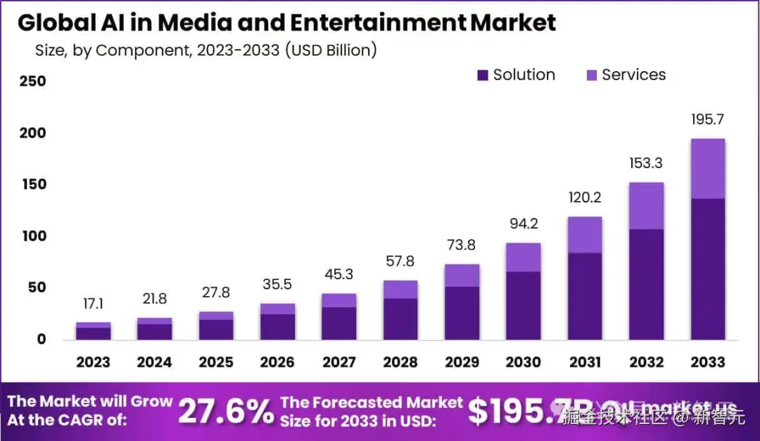 一项调查显示,预计 AI 媒体市场规模将从 2023 年的 171 亿美元,大幅增长至 2033 年的 1957.7 亿美元,复合年增长率直接达到 27.6%。