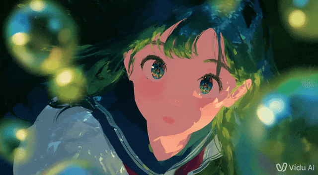 提示词:梦幻动漫女孩的特写镜头,有着闪闪发光的星系般的眼睛和飘逸的深绿色头发,被发光的球体和神奇的散景灯柔和地照亮,吉卜力和新海诚的灵感,16:9 的宽高比