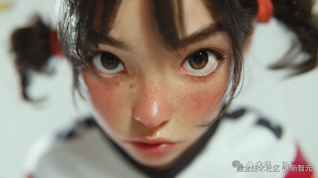 视频中是一个超写实的动漫风小女孩,脸上的雀斑以及皮肤的纹理都清晰可见,尤其是她那双大大的眼睛,如此的生动有神。