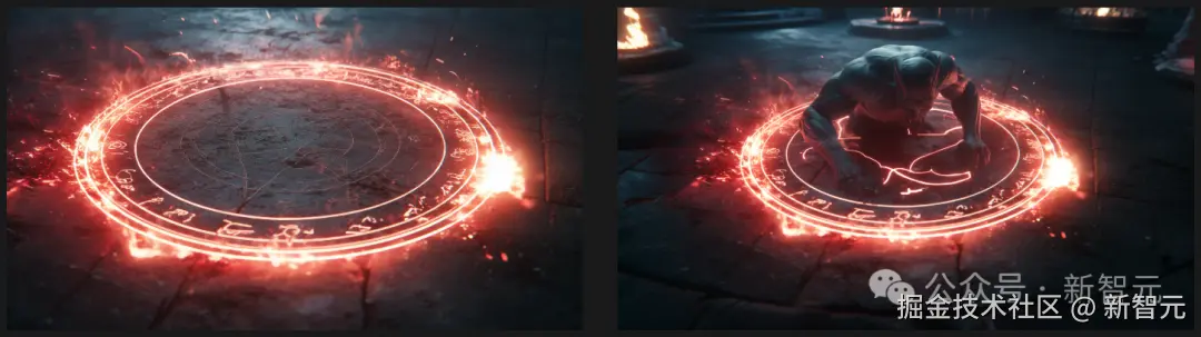比如首帧是地面上一个圆圈,尾帧是圆圈中出现一个魔鬼,就可以生成「从圆圈中召唤出魔鬼」的一个电影片段了。