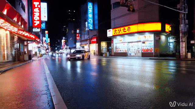 比如下面场景,从左至右分别是 Runway-Gen3 Alpha、Veo2 、Vidu Q1。要求生成富士胶片的质感、大幅度的运镜、日产的 GTR 以及午夜的东京,Q1 都能很好地抓住要点,找到那种感觉!