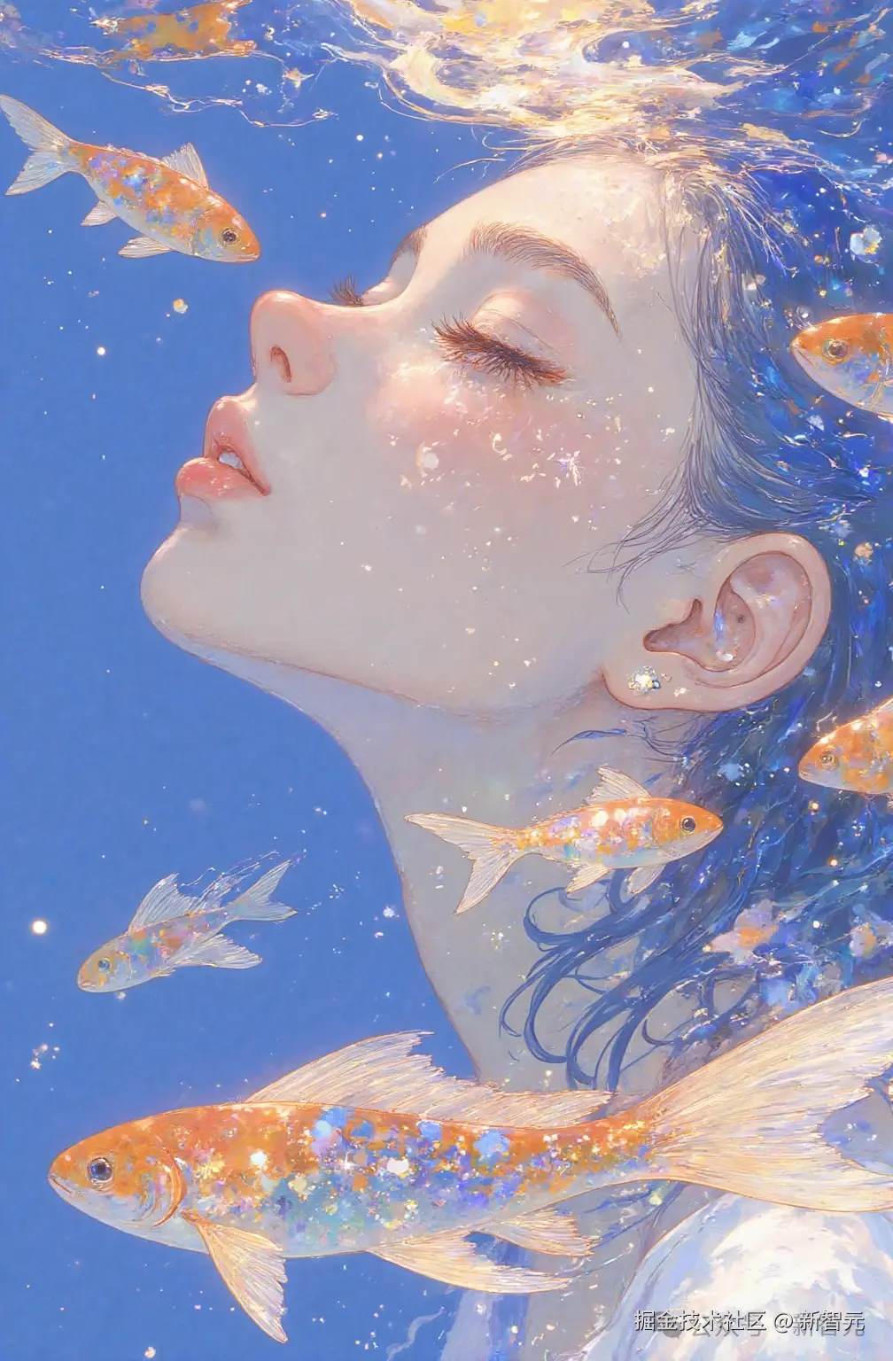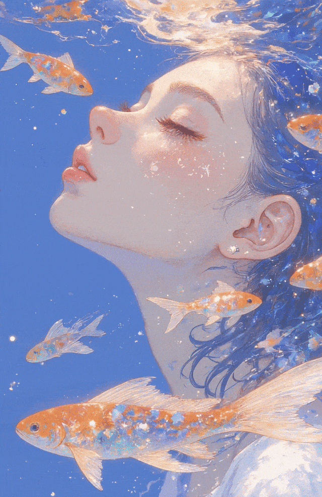 提示词:女生在水中,水波带动她的头发,水波在她脸上投下光影,她缓缓扭头看向镜头