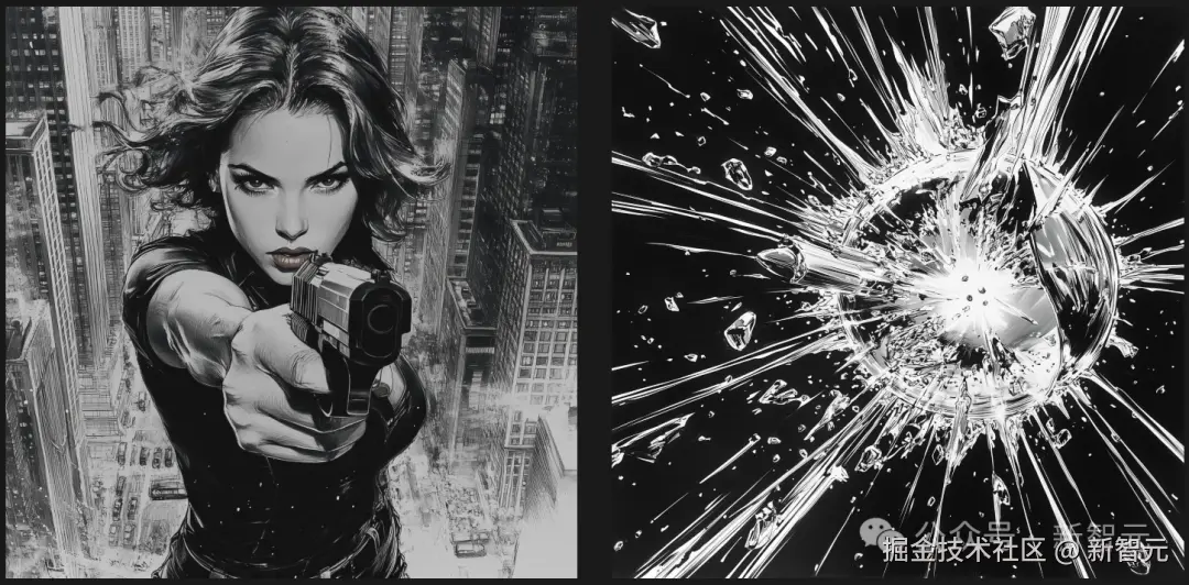 首帧是女特工手持手枪,尾帧是子弹穿破玻璃球瞬间爆炸。在 prompt 中描述「吉恩 · 科兰的漫画风格,紧张刺激的动画场景」,一段完美的动漫场景就生成了。