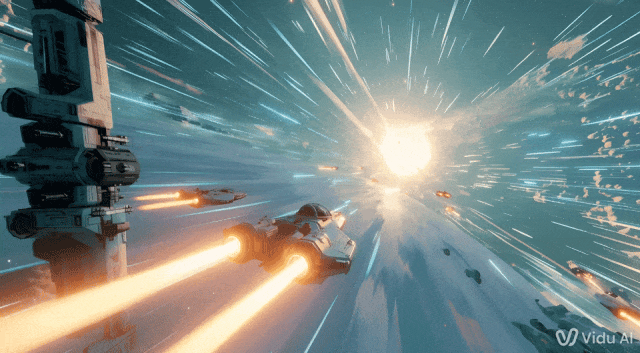 另外,Q1 针对复杂场景的把控也是一流的,生成飞船在太空中穿行的画面中,多架飞船如光影交错般,并没有出现画面不稳定的情况。