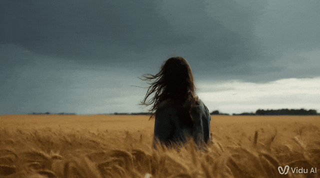 在这个例子中,首帧是一个金发女孩站在麦田中的背影,尾帧是她在雨中情绪复杂地望着天。