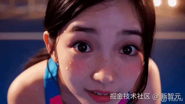 提示词:一个身穿运动服的超现实动漫风格女孩,被特写镜头捕捉到,她满脸雀斑,汗流浃背,脸颊绯红,睁大的眼睛反映出情感和好奇,对着镜头眨眼微笑,慢慢地把手伸向屏幕,广角微距镜头拍摄,超现实的纹理与风格化的柔和相结合,充满情感的时刻,16:9 的宽高比