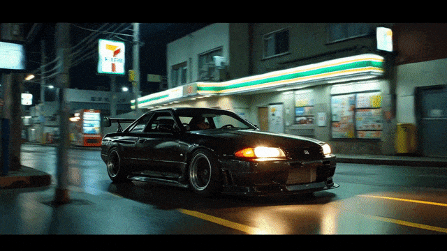 提示词:富士胶片 Portra 400H 静态照片,急驰的日产天际线 R33 GTR LM JGTC,大幅度运动效果,东京 7-11 便利店,午夜时分