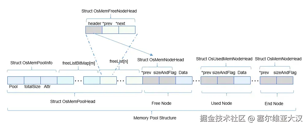 初始化LOS_MemInit。 初始一个内存池后生成一个内存池控制头、尾节点EndNode,剩余的内存被标记为FreeNode内存节点。注:EndNode作为内存池末尾的节点,size为0。