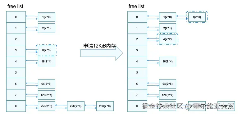 - 申请内存 系统申请12KiB内存,即3个页帧时,9个内存块组中索引为3的链表挂着一块大小为8个页帧的内存块满足要求,分配出12KiB内存后还剩余20KiB内存,即5个页帧,将5个页帧分成2的幂次方之和,即4跟1,尝试查找伙伴进行合并。4个页帧的内存块没有伙伴则直接插到索引为2的链表上,继续查找1个页帧的内存块是否有伙伴,索引为0的链表上此时有1个,如果两个内存块地址连续则进行合并,并将内存块挂到索引为1的链表上,否则不做处理。