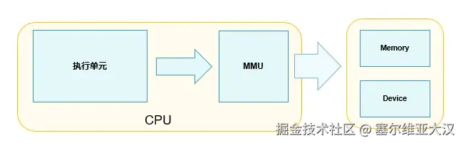 虚实映射是指系统通过内存管理单元(MMU,Memory Management Unit)将进程空间的虚拟地址与实际的物理地址做映射,并指定相应的访问权限、缓存属性等。程序执行时,CPU访问的是虚拟内存,通过MMU页表条目找到对应的物理内存,并做相应的代码执行或数据读写操作。MMU的映射由页表(Page Table)来描述,其中保存虚拟地址和物理地址的映射关系以及访问权限等。每个进程在创建的时候都会创建一个页表,页表由一个个页表条目(Page Table Entry, PTE)构成,每个页表条目描述虚拟地址区间与物理地址区间的映射关系。MMU中有一块页表缓存,称为快表(TLB, Translation Lookaside Buffers),做地址转换时,MMU首先在TLB中查找,如果找到对应的页表条目可直接进行转换,提高了查询效率。CPU访问内存或外设的示意图如下: