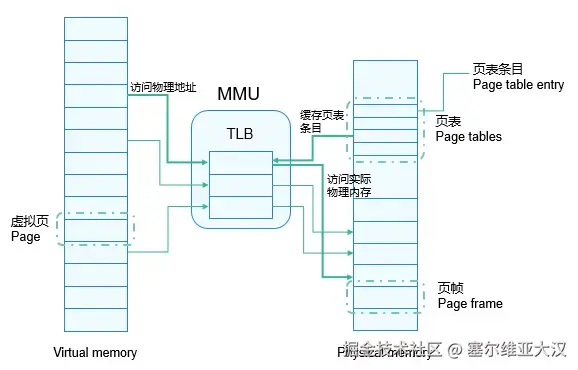 程序执行时,如下图粗箭头所示,CPU访问虚拟地址,通过MMU查找是否有对应的物理内存,若该虚拟地址无对应的物理地址则触发缺页异常,内核申请物理内存并将虚实映射关系及对应的属性配置信息写进页表,并把页表条目缓存至TLB,接着CPU可直接通过转换关系访问实际的物理内存;