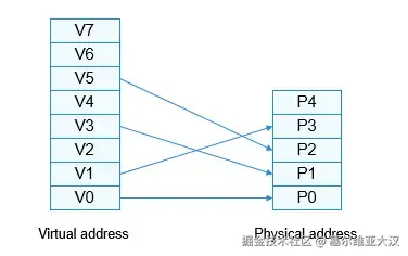 CPU访问的虚拟地址所在的页,如V2,没有与具体的物理页做映射,系统会触发缺页异常,系统申请一个物理页,并把相应的信息拷贝到物理页中,并且把物理页的起始地址更新到页表条目中。此时CPU重新执行访问虚拟内存的指令便能够访问到具体的代码或数据。