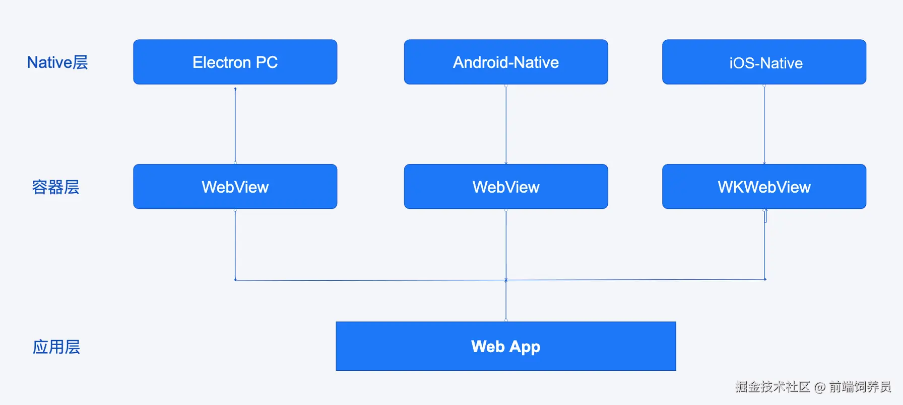 实际上,Web App 是一种使用 HTML5 编写的,运行在 PC、Android、iOS 等平台上的 Web 应用,这种 Web 应用想要运行在各种平台的客户端上,需要依赖客户端的容器层以及一定的通信能力。