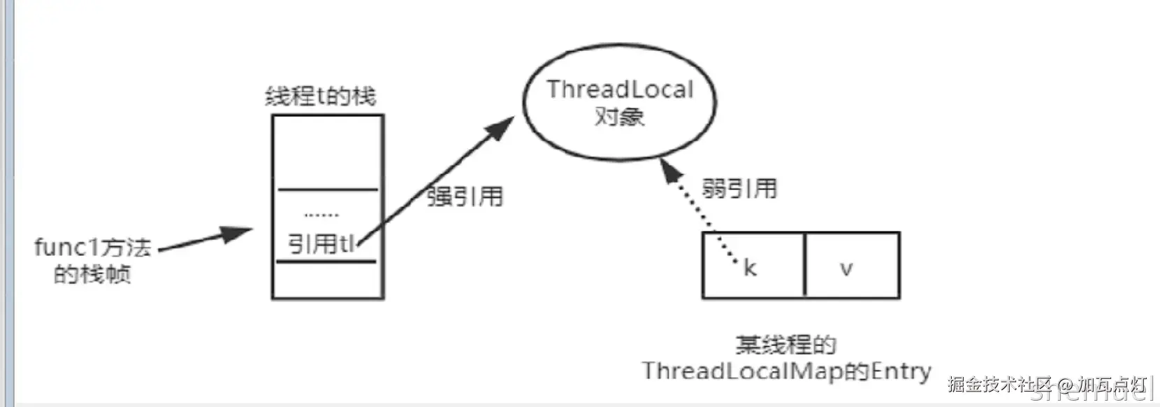当方法结束后栈帧弹栈,那么对应的图中 的强引用自然就没了, 而ThreadLocal身上,此时只有一个弱引用,
