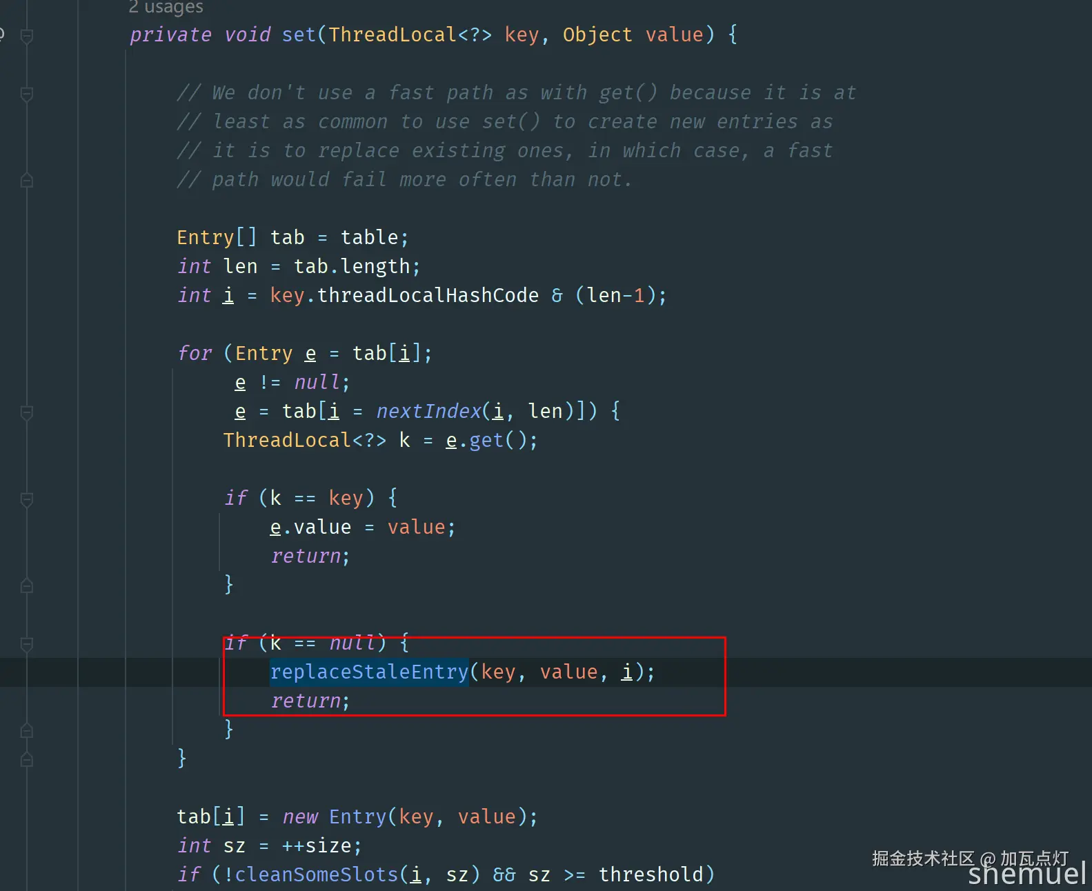 当我们调用 ThreadLocal#set 方法时,实际上就是往当前线程的 ThreadLocalMap 中存放键值对。这个 Map 并不是标准的 java.util.Map,它是 ThreadLocal 的静态内部类,专为这个目的设计。