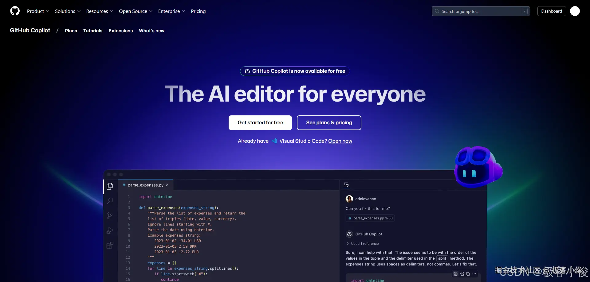 我们可以点击Get started for free按钮进入到网页版本的GitHub Copilot进行体验!