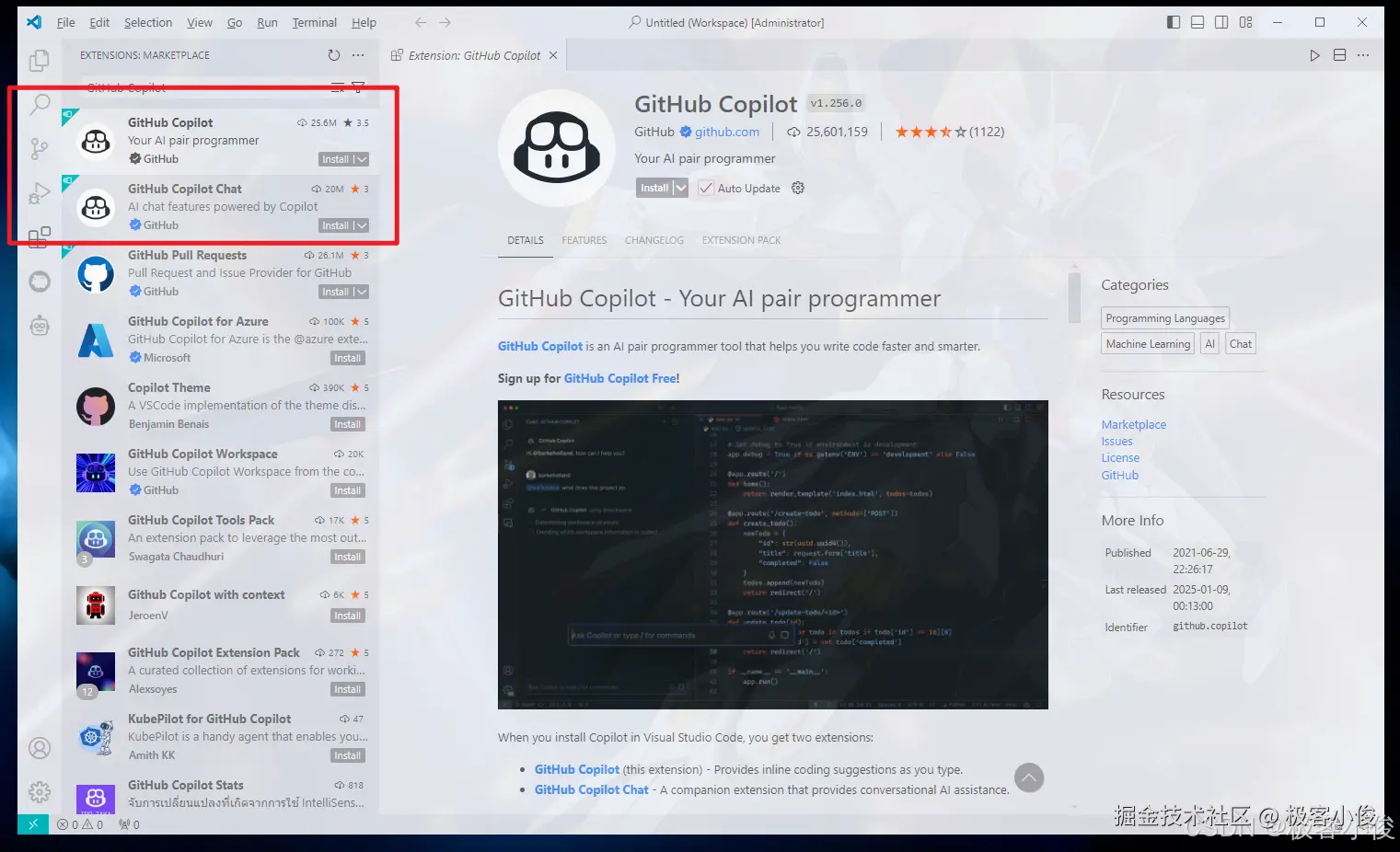 安装好了之后打开VSCode在插件市场或扩展商店中搜索GitHub Copilot