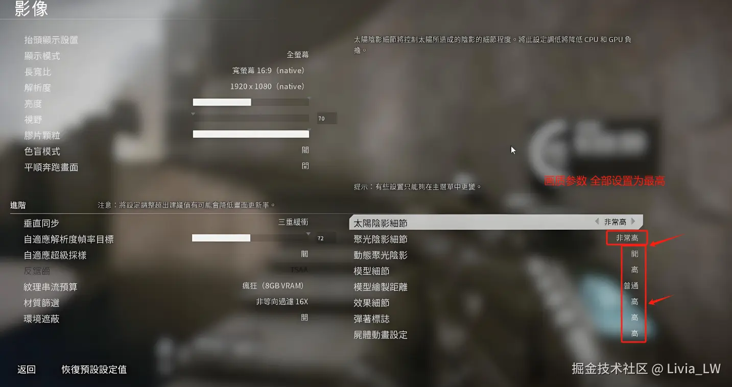 我这里将所有画质设置为最高,测试了一下极限状态下的效果