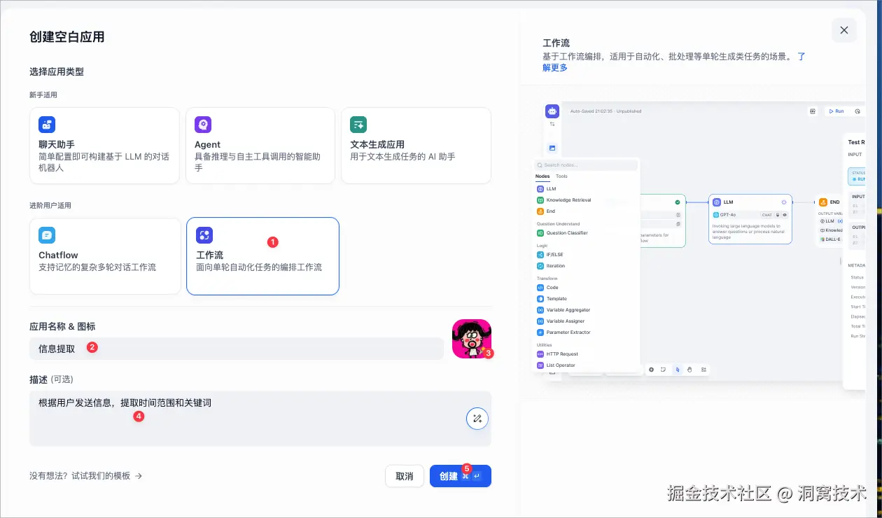 我们可以根据需求创建一个工作流应用,应用名就叫【信息提取】
