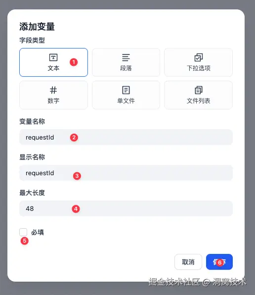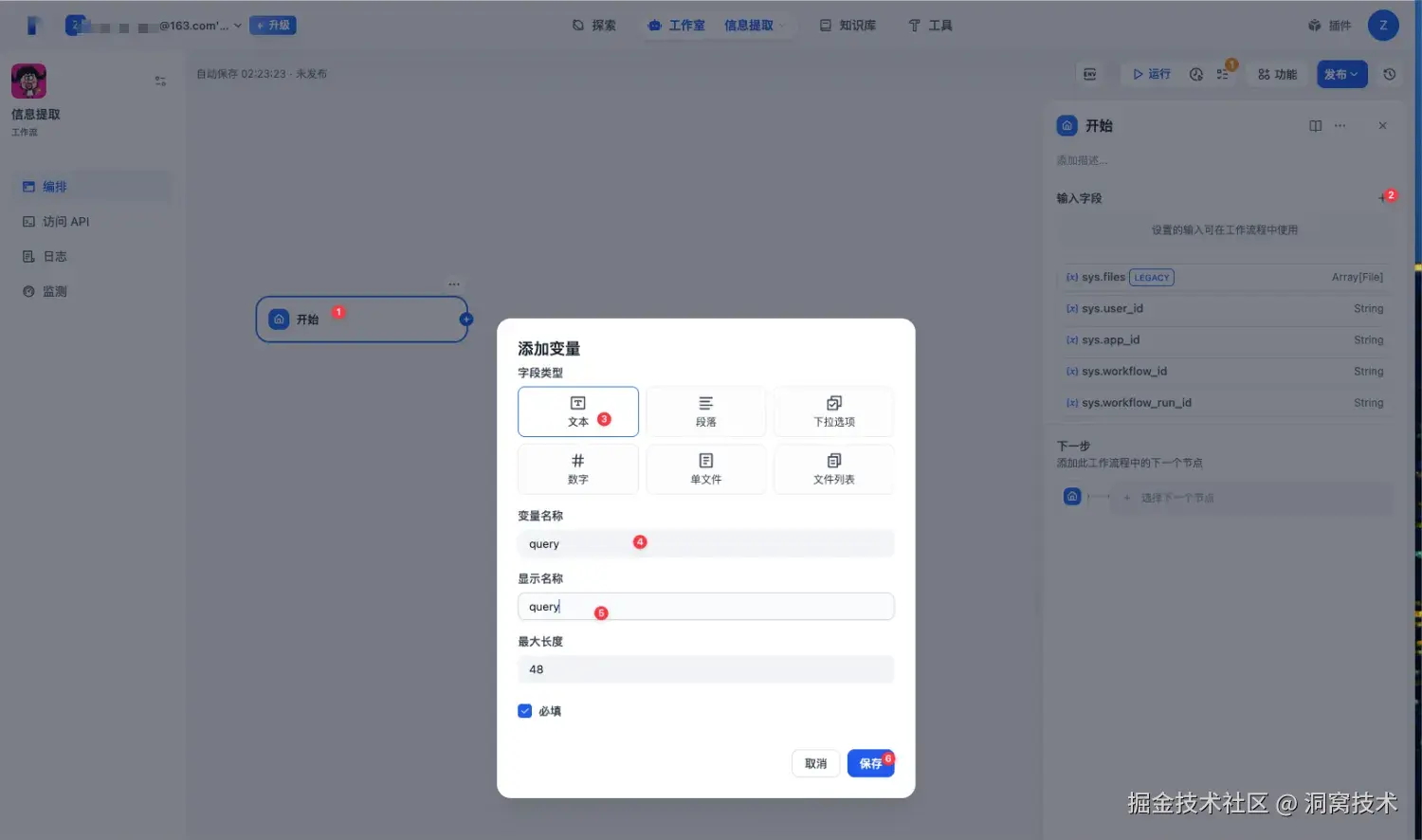 我们首先选择【开始】节点,在右侧会展示该节点可以配置的元数据。在【输入字段】项点击【+】添加变量。在这里点击字段类型为文本,设置【变量名称】和【显示名称】以及【最大长度】,是否【必填】。显示名称会默认使用变量名称。点击【保存】就添加了一个名为【query】的变量。api调用时用来接收用户信息。