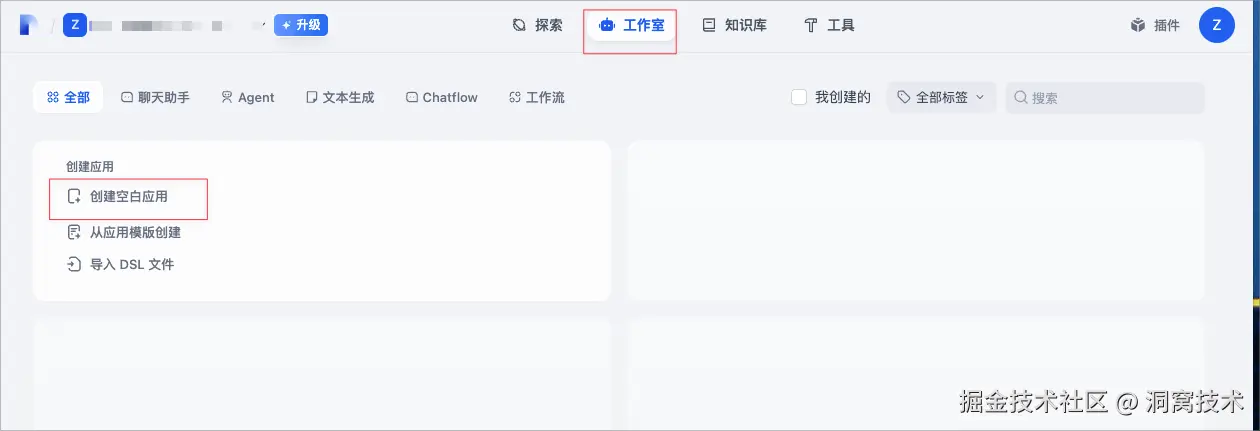 首选需要一个Dify账号,进入Dify工作室页面,选择创建空白应用。