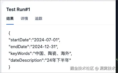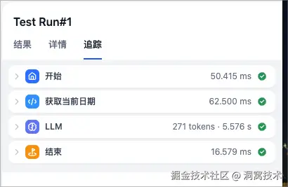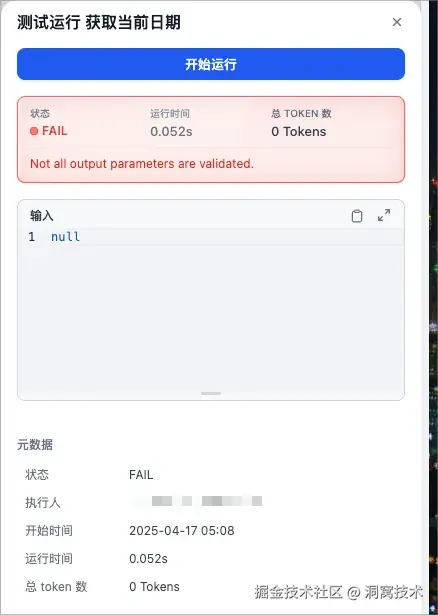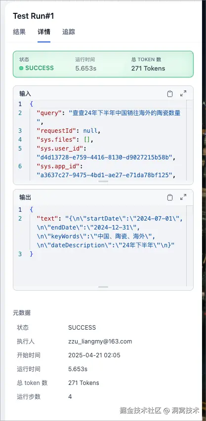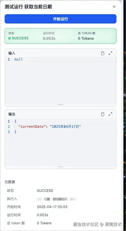 点击【开始运行】按钮,等待运行结果。如果是SUCCESS状态并且输出栏符合预期,那就可以继续添加下一个节点了。如果是FAIL状态,可以根据错误日志检查问题并调整。