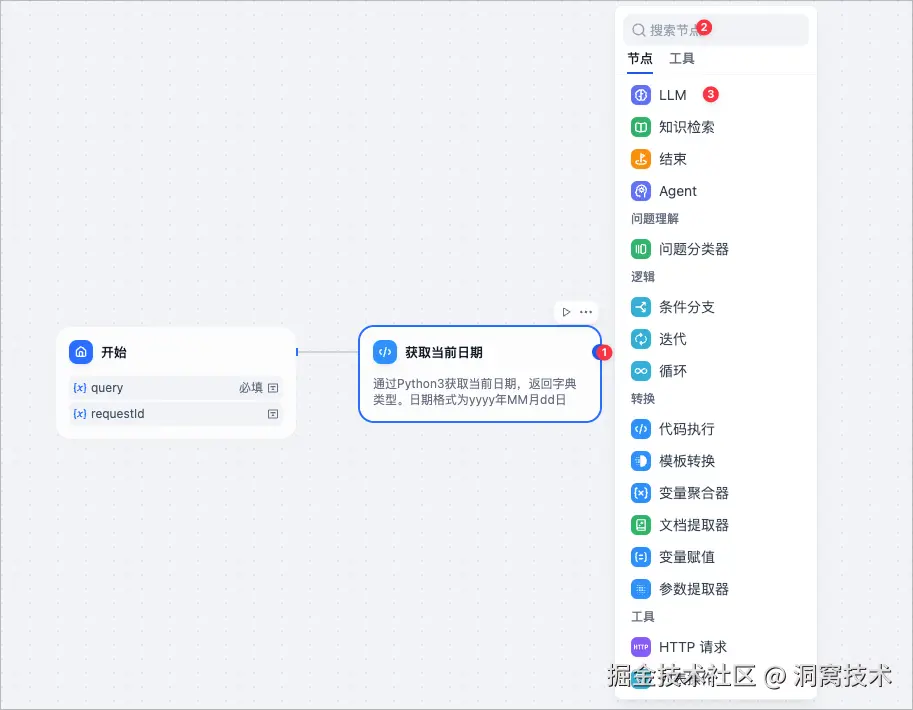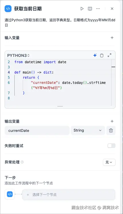 有了开始节点作为工作流的入口,获取到用户输入信息之后,我们可以添加后续节点【代码执行】通过Python或NodeJS处理一些代码逻辑。比如当前节点获取当前日期