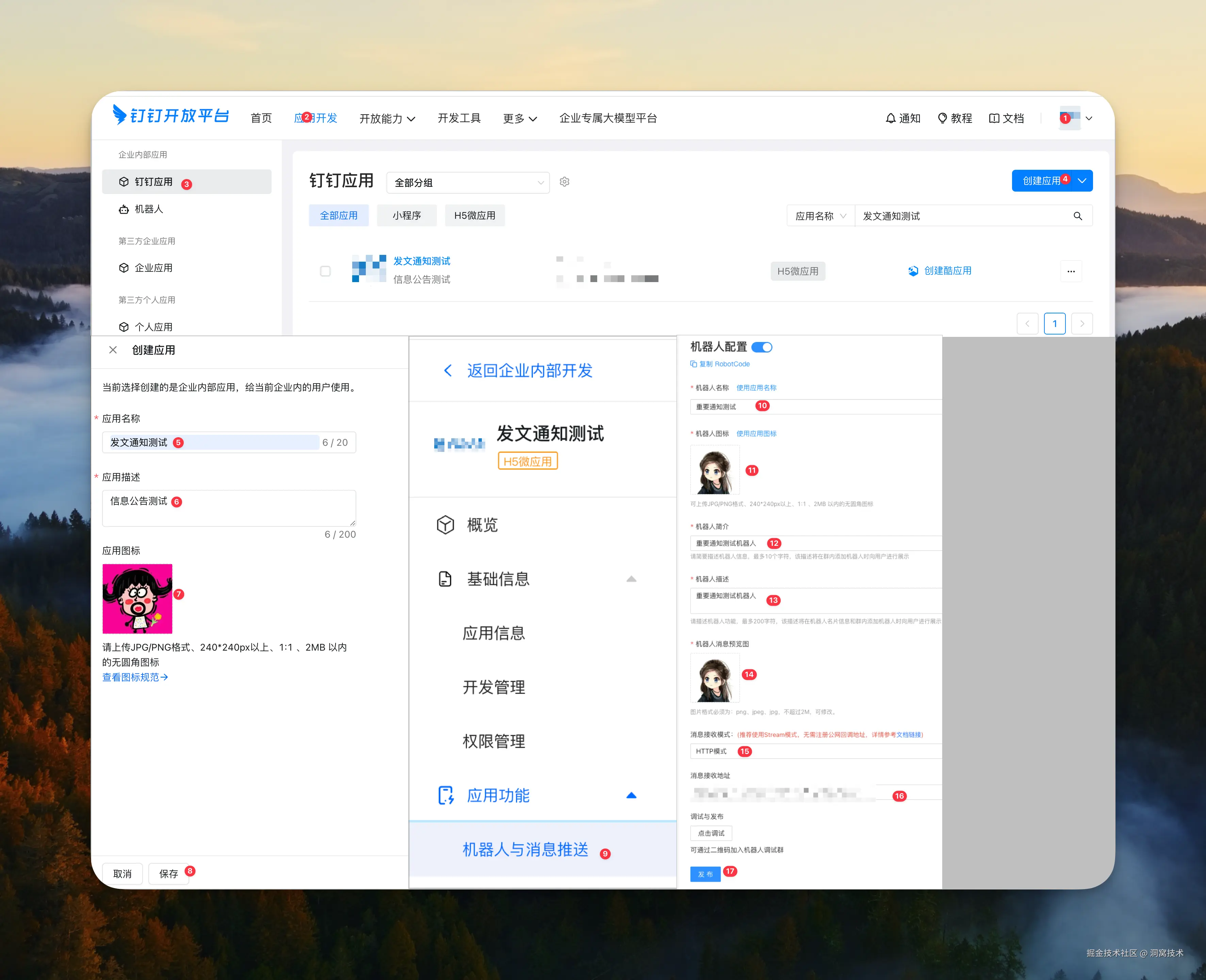 通过钉钉提供的企业内部应用,创建【发文通知测试】应用。填写应用名称、应用描述、应用图标。
