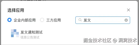 应用创建成功之后可以通过应用名称检索,在应用列表检索结果中点击【发文通知测试】应用,进入应用详情。