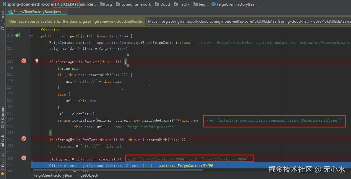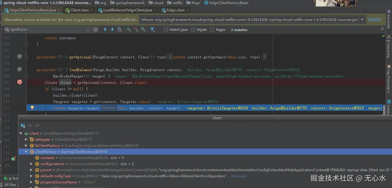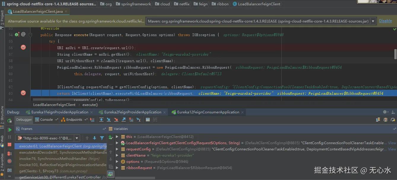 consumer发起请求的时候,provider1通过 LoadBalancerFeignClient 获取可用的服务提供者。