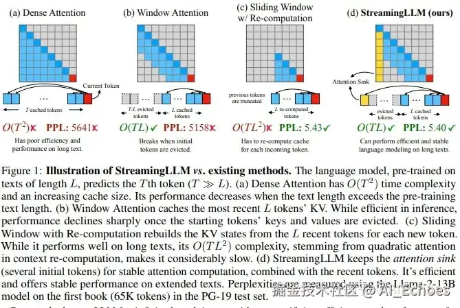比起密集注意力(Dense Attention)、窗口注意力(Window Attention)以及带重计算的滑动窗口注意力(Sliding Window w/ Re-computing),StreamingLLM基于attention sink的注意力机制无论是在计算复杂度还是生成效果上都表现优异。