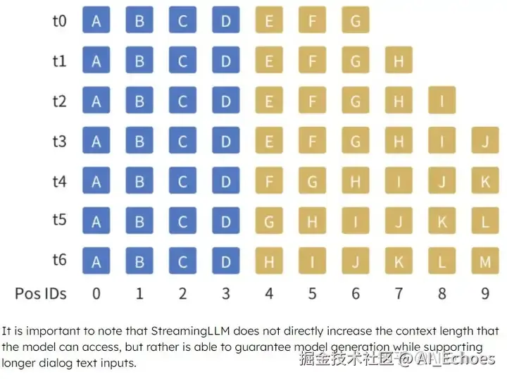 如下图所示,假设窗口大小为10个token,随着生成的token增加(由黄色方块表示),我们在KV 缓存中将中间的token踢出,与此同时,始终保持着文本开始的几个token(由蓝色方块表示)。由 于黄色方块的位置会发生变化,在计算注意力时,我们也需要重新注入位置信息。