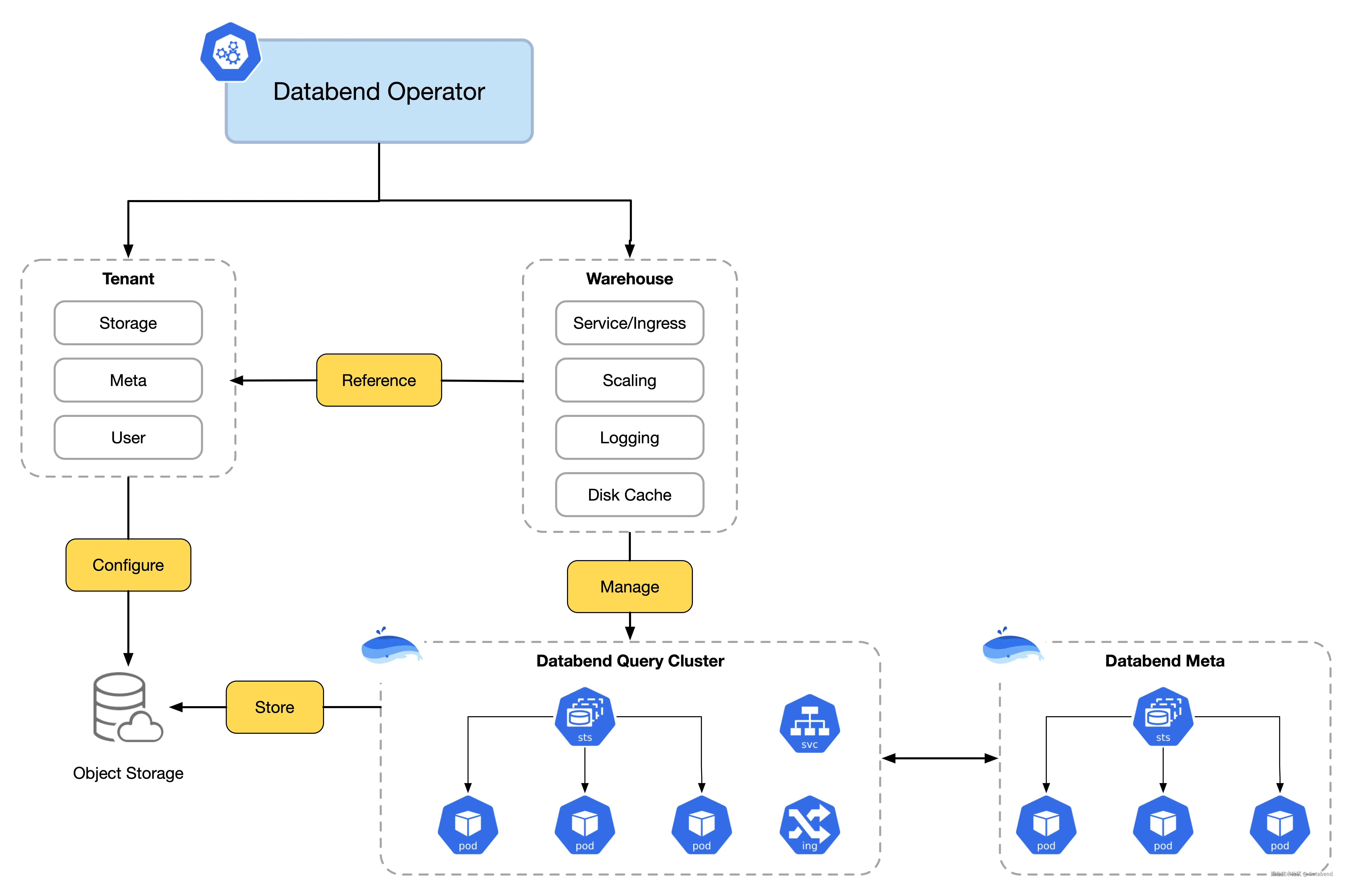 Databend Operator 在集群中维护两类 CRD:Tenant 和 Warehouse。Tenant 定义对象存储端点、Meta 信息和用户配置;Warehouse 通过 tenantRef 引用 Tenant,并声明计算镜像、实例数、Disk Cache 配置与日志策略。Operator 监听这两类 CRD,同时为每个 Warehouse 生成一套 Databend Query StatefulSet 及其 Service/Ingress,并确保它们与 Databend Meta StatefulSet 建立了连接并完成了注册。Query 节点对数据块进行读写,Meta 节点保存元数据,两者共同实现存算分离;伸缩、滚动更新、可观测性等运维细节全部由 Operator 自动处理。