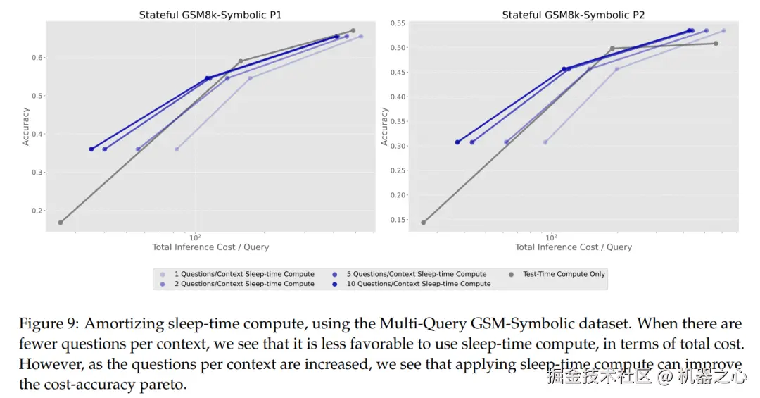 作者还希望了解如何通过在每个上下文都有多个查询的设置中应用睡眠时间计算来改善推理的总成本。我们看到,与单查询基线相比,当每个上下文有 10 个查询时,每个查询的平均成本降低多达 2.5 倍。