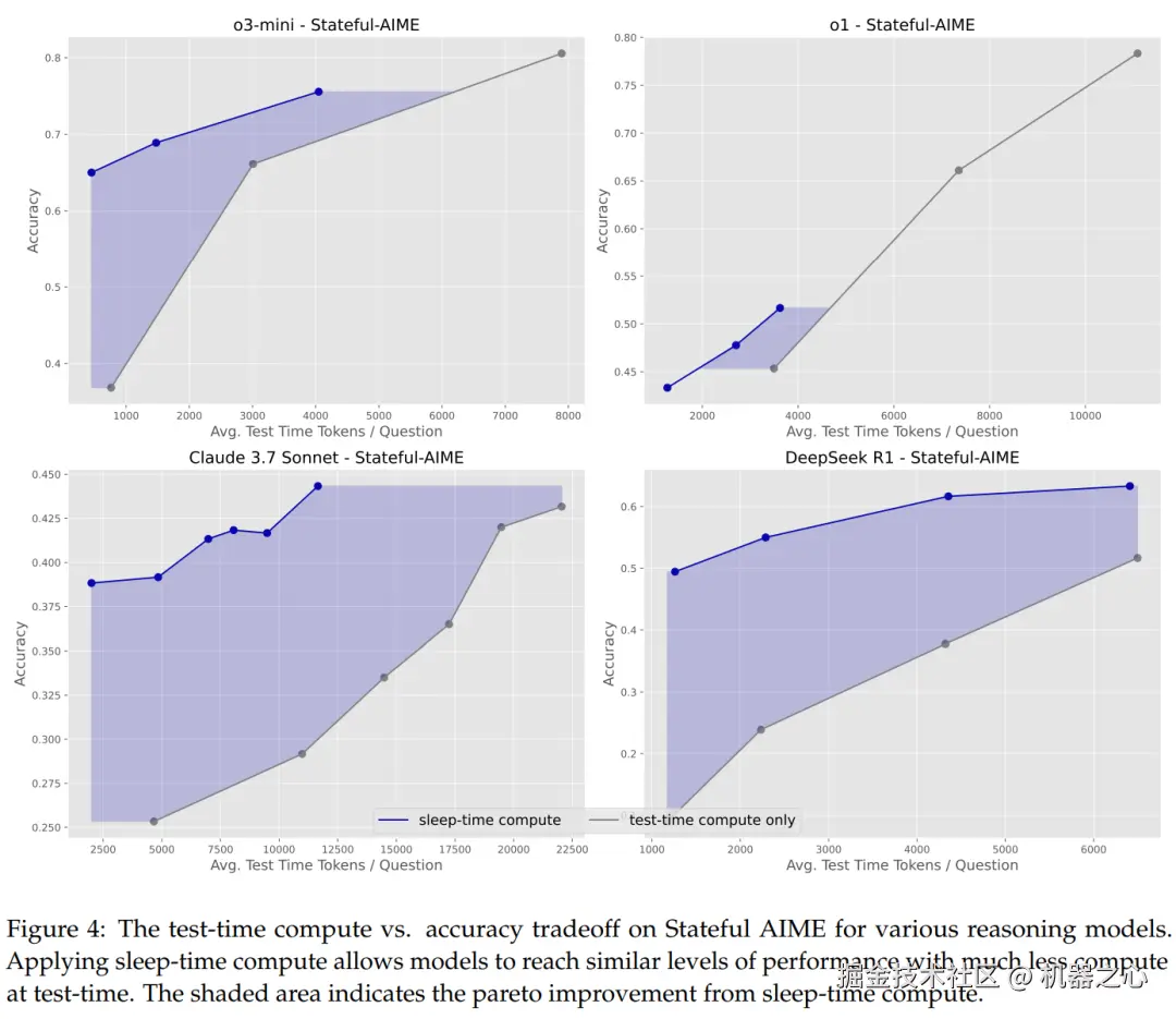 图 4 展示了不同模型在 Stateful AIME 数据集上的结果。我们看到,应用睡眠时间计算后,测试时间和准确率都发生了显著的帕累托偏移,但 o1 除外,它的增益有限。