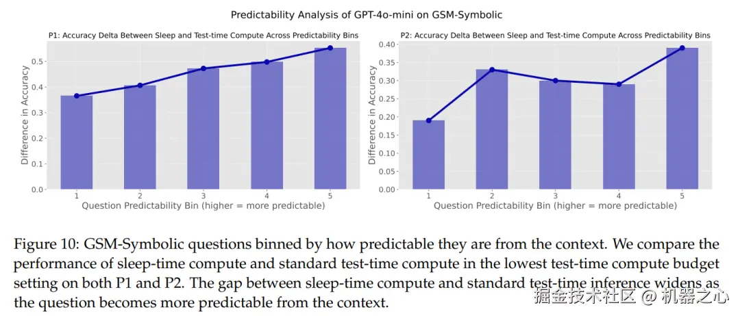 在图 10 中,我们看到随着问题从上下文中变得更加可预测,睡眠时间计算和标准测试时间计算之间的准确度差距不断扩大,这证实了本文的假设,即当问题能够通过上下文预测时,睡眠时计算最能发挥其优势。