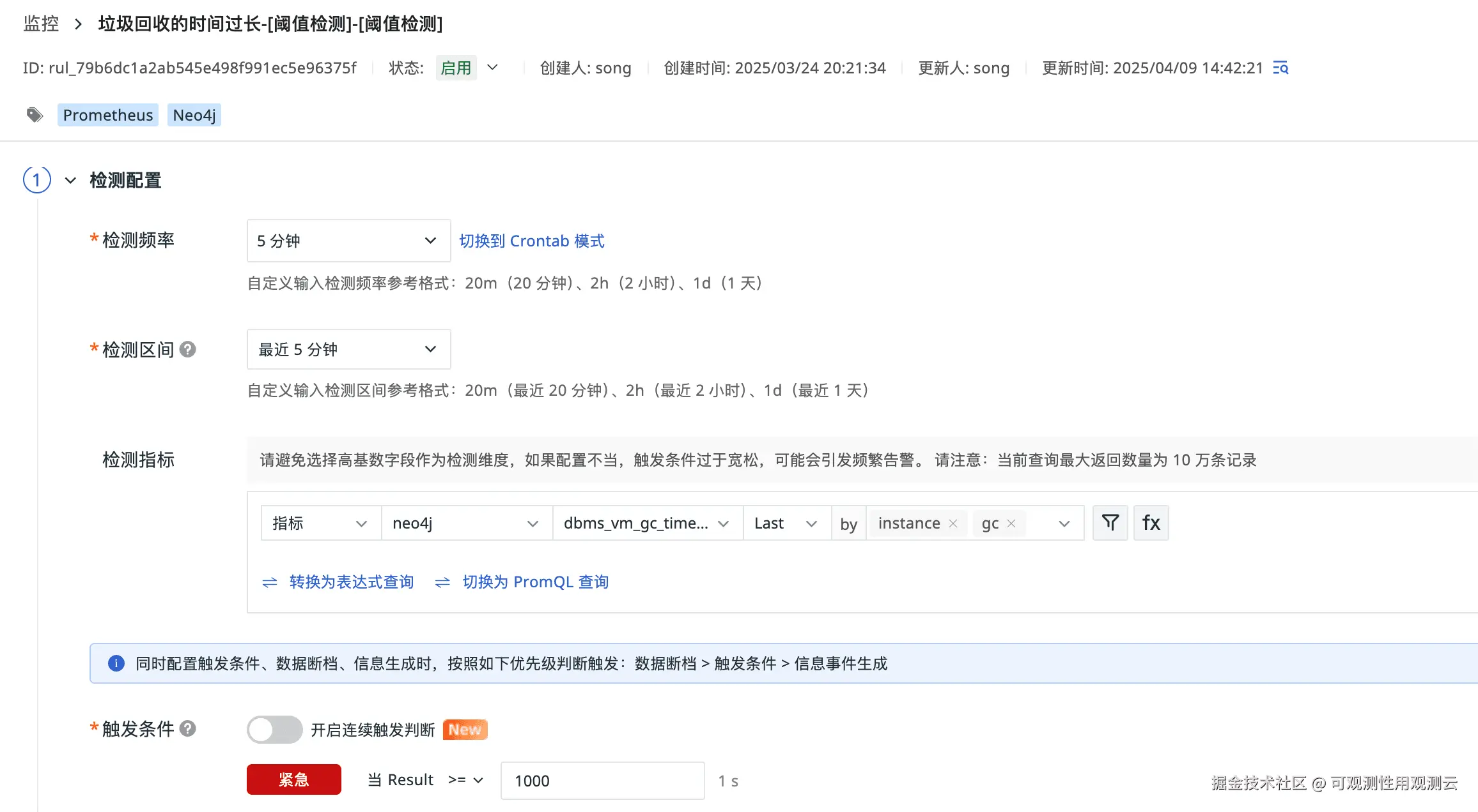 Neo4j 作为一款高性能的图数据库,其性能监控对于确保数据查询效率和整体系统稳定性具有重要意义。通过合理利用观测云等监控工具,可以全面、实时地监控 Neo4j 的运行状态。