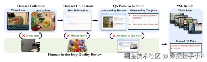 4、数据质量和控制:VSI-Bench基于人工审核确保数据质量,消除歧义和错误标注,提高测试结果的可靠性。