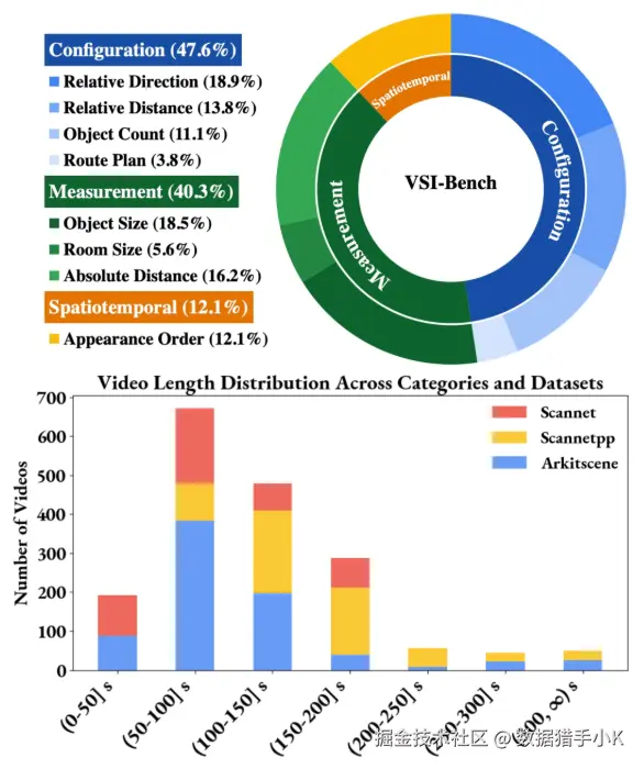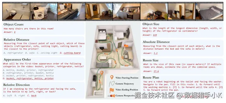 2、任务多样性:数据集任务分为配置型任务(如物体计数、相对距离等)、测量估计(如物体尺寸、房间大小等)和时空任务(如物体出现顺序),全面覆盖视觉空间智能的多个方面。