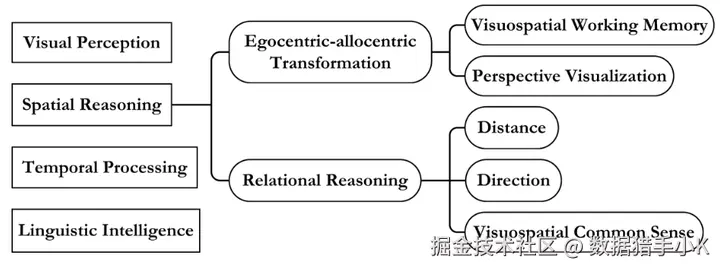 涉及理解和推理物体之间的关系,包括距离(Distance)、方向(Direction)和视觉空间常识(Visuospatial Common Sense)。