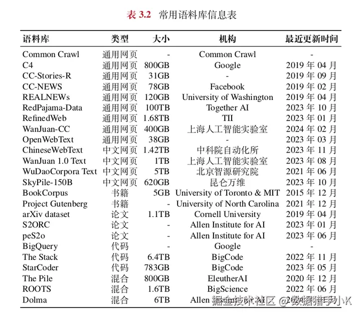 预训练数据集是大语言模型训练的基础,本节介绍了多种常用的预训练数据集,涵盖了网页、书籍、维基百科、代码和混合型数据集。