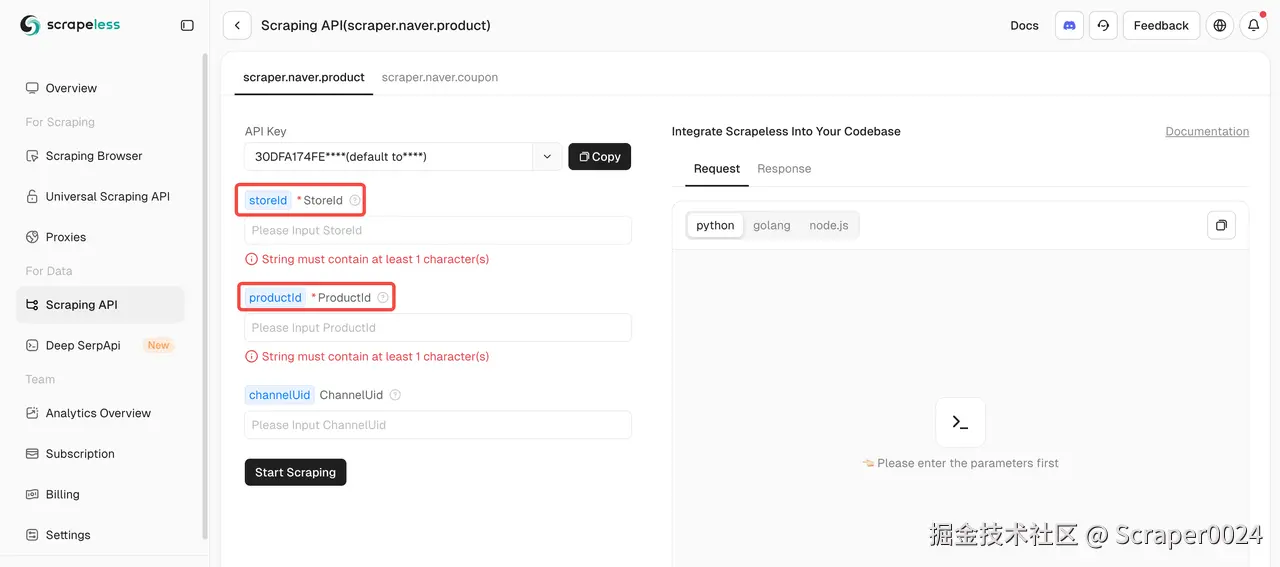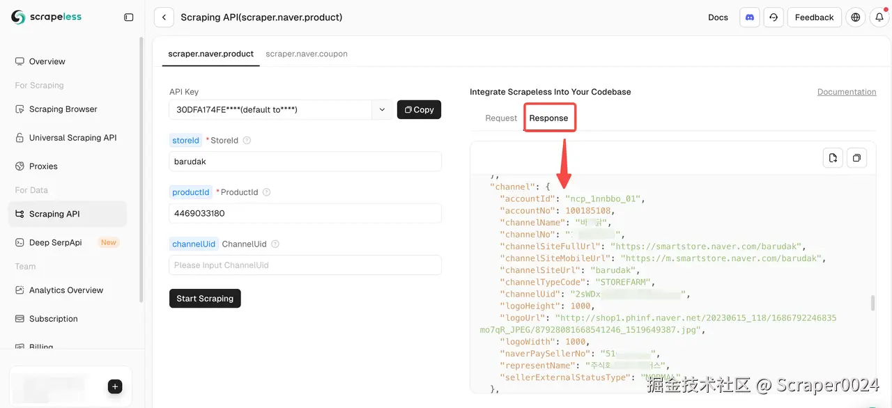 使用Naver抓取API抓取产品数据时,您必须提供两个必填参数:storeId 和 productId。channelUid参数是可选的。