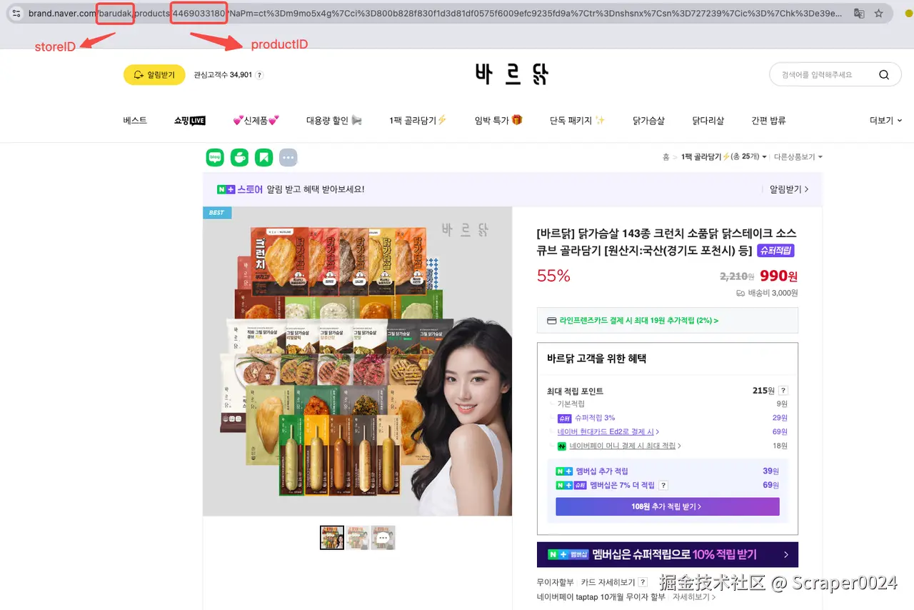 您可以在产品URL中直接找到产品ID和商店ID。例如,以[바르닭] 닭가슴살 143종 크런치 소품닭 닭스테이크 소스큐브 골라담기 [원산지:국산(경기도 포천시) 등]为例: