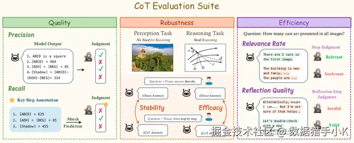 推理鲁棒性:通过稳定性和效能等指标,评估 CoT 对不同类型任务(如感知任务和推理任务)的影响。