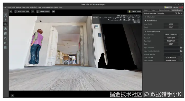 Jetbot 在动态的 Matterport3D 环境中导航,并有移动的人类障碍物。