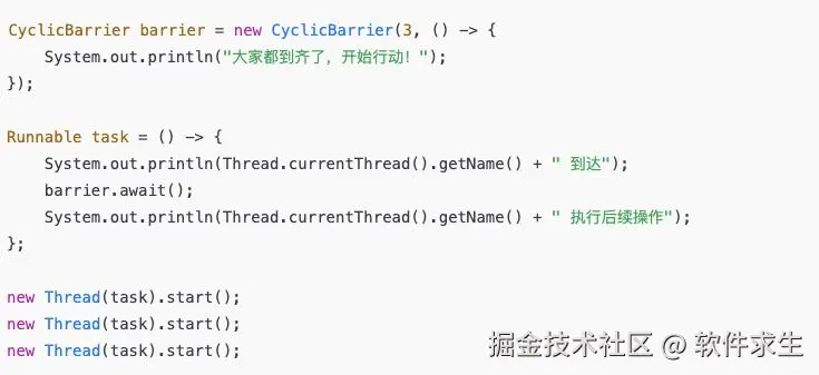 - 可以设置回调 Runnable,当最后一个线程到达时执行