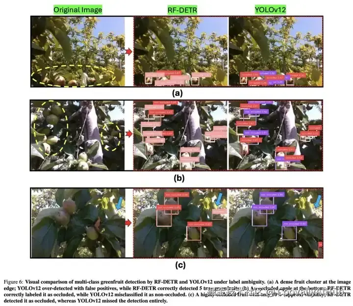 同样,图6c展示了一个具有挑战性的低可见度案例,在该案例中,只有10% 的绿色水果在树叶遮挡下可见(蓝色箭头所示)。RF-DETR成功检测到并将其归类为隐蔽(中),而 YOLOv12则完全检测不到水果(右)。这加强了RF- DETR处理极端闭塞的能力。