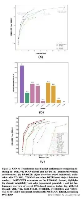 在图1所示的六种主要目标检测方法中,基于CNN和Transformer的模型在过去五年中得到了最广泛的应用和最积极的发展。这两种模式因其扩展性、准确性和适应性,目前在研究和实际应用中都占据主导地位。这种持续的主导地位引发了这两种方法之间的竞争演变,特别是随着基于transformer-based的强大模型的发布,如Roboflow开发的RF-DETR。RF-DETR整合了Deformable DETR和LW-DETR的架构创新,并采用DINOv2骨干,提供更优越的全局上下文建模和领域适应性。该模型消除了对锚框和非最大抑制(NMS)的依赖,支持端到端训练和实时推理。RF-DETR有两个变体,即基本型(29M)和大型(128M),具有从边缘部署到高性能场景的可扩展性。该模型的性能已被证明优于YOLOv11,并且是迄今为止唯一一个在COCO数据集上超过60% mAP的模型。图2a和2b展示了该模型在 COCO和RF100-VL基准上的性能。不过,尽管RF-DETR前景看好,但尚未正式与YOLO 系列中最新、最先进的模型YOLOv12进行基准测试。如图2c所示,YOLOv12建立在YOLOv11、YOLOv10和Gold-YOLO RT-DETR的基础之上,因此有必要进行比较评估。