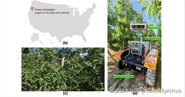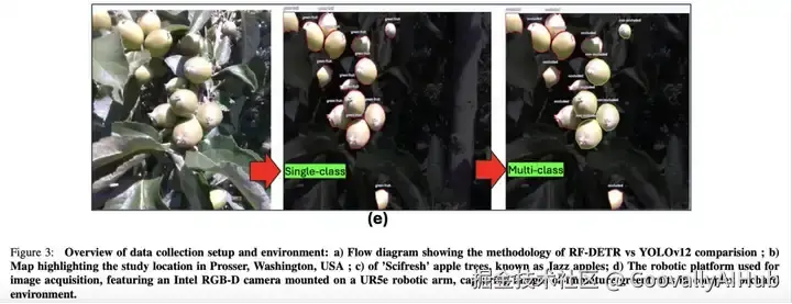 本实验分四个步骤进行,如图3a所示。首先,从一个条件复杂的商业果园中收集真实的田间图像,其特点是未成熟的绿色水果在绿色树冠下伪装、由于遮挡,给机器视觉带来了巨大挑战。随后,使用机器人平台和机器视觉相机捕捉这些图像,然后进行预处理和准备。第三步,使用相同的数据集、超参数和epoch数,实现了RF-DETR和YOLOv12这两个深度学习模型。最后,对这些模型的性能进行了评估,看它们能否在这一具有挑战性的果园环境中检测出单类和多类绿色水果物体。